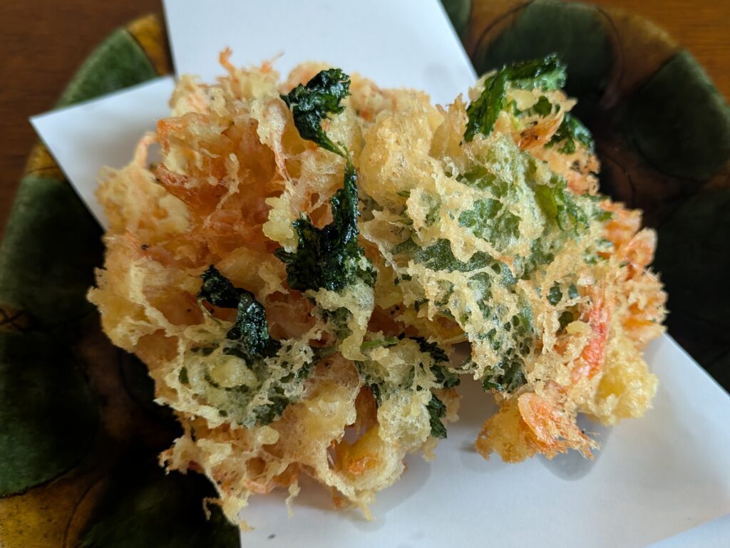 サクラエビを旬の春野菜や魚介類と合わせてかき揚げにしました。サクラエビの香りと食感が他の具材と相まって美味しく食べられます。