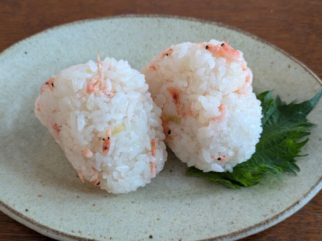 お米を炊く時にサクラエビを入れて作った炊き込みご飯のおにぎりです。